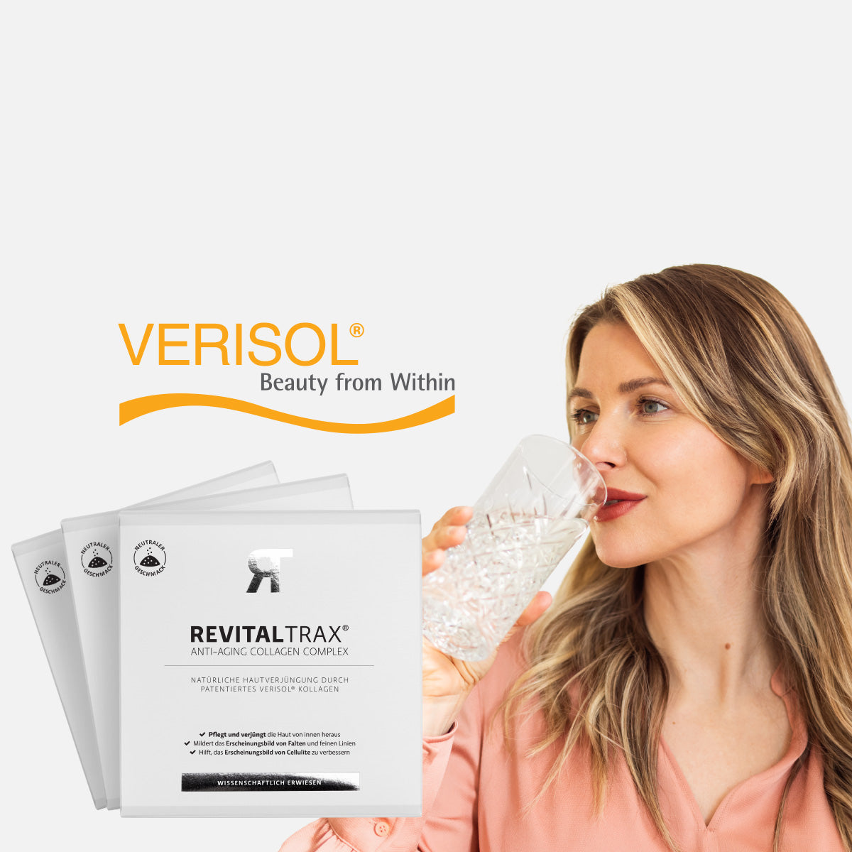 Erfahren Sie, warum unser Collagen Complex mit patentiertem Verisol® bei unseren Kundinnen und Kunden so beliebt ist. Erhältlich in zwei Geschmacksrichtungen: Regular und Zitrone.