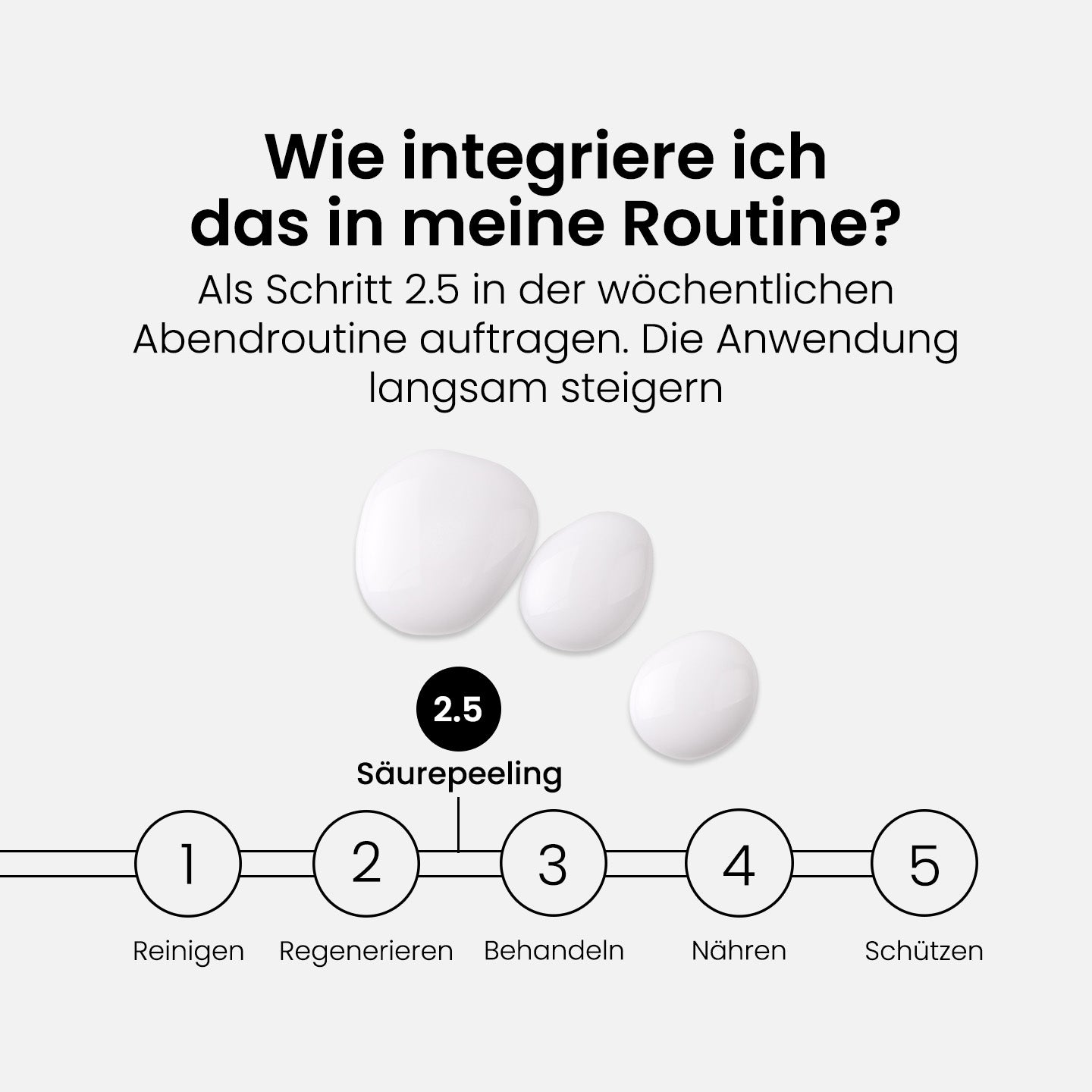 Beginnen Sie mit ein bis drei Anwendungen pro Woche am Abend. Wenn Ihre Haut das Produkt gut verträgt, kann die Häufigkeit auf drei bis fünf Mal pro Woche gesteigert werden.